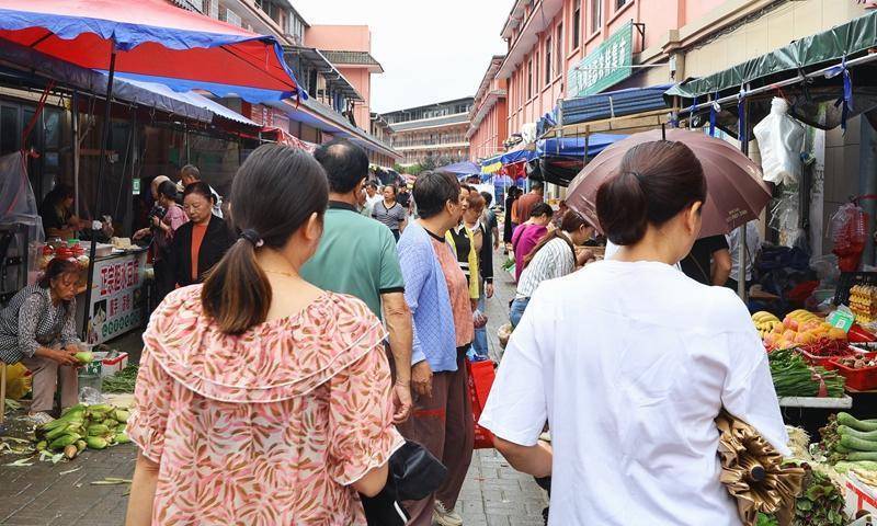 避暑游客在乡村集市选购农产品。王洪娅摄